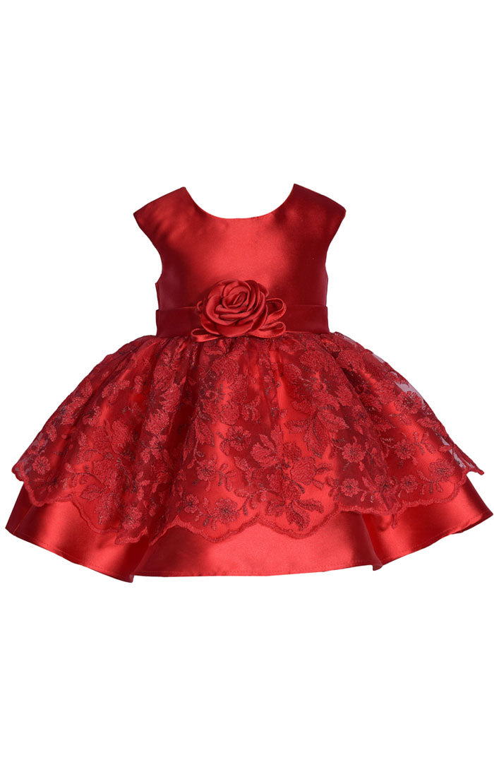 Sleeveless Mikado to scalloped hem lace party dress with band and flower at the waist.